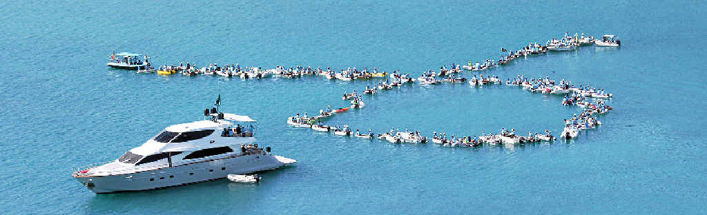 The event sees yachties align their vessels off Shag Islet in the shape of the Prostate Cancer Foundation of Australia symbol, with live music setting the scene from a nearby super yacht.