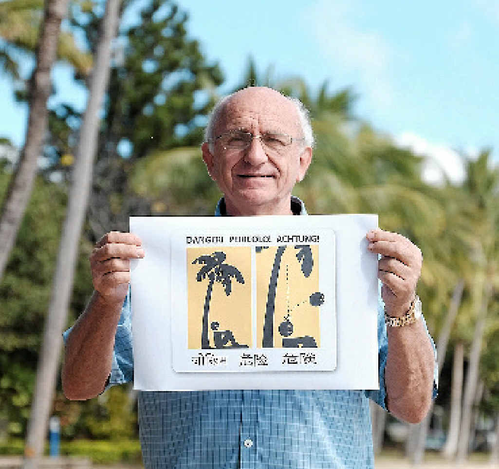 The association's members have been discussing the design of a universal sign (pictured right) to warn tourists and locals alike of the perils of sitting or walking under coconut trees.